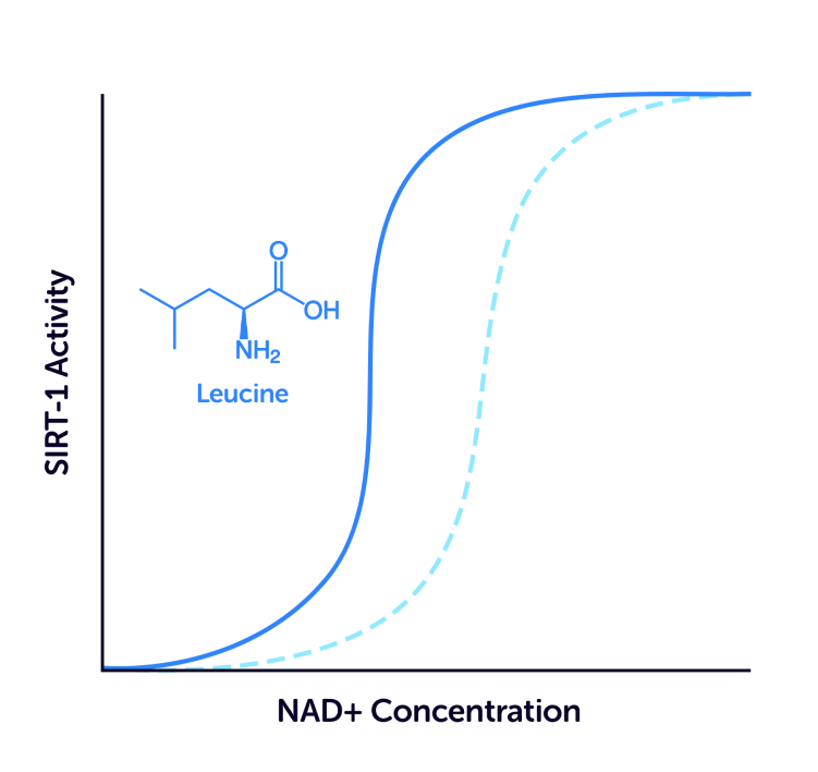 With Leucine, LESS NAD+ is needed for SIRT-1 functions, improving NAD+ utilization in other cellular pathways.